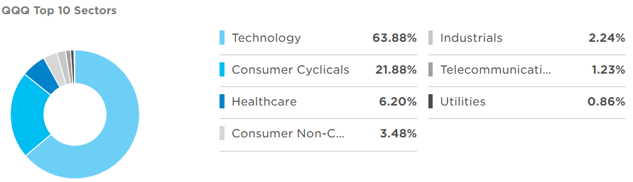 산업 분야 비율을 보면 어딘가로 확! 쏠려 있는 것을 보실 수 있습니다. 기술에 무려 63%가 치중되어 있네요. 그래서 기술주 ETF라고 해도 거의 무방합니다. SPY도 기술주 비중이 높지만 QQQ에 비하면 새발의 피입니다.